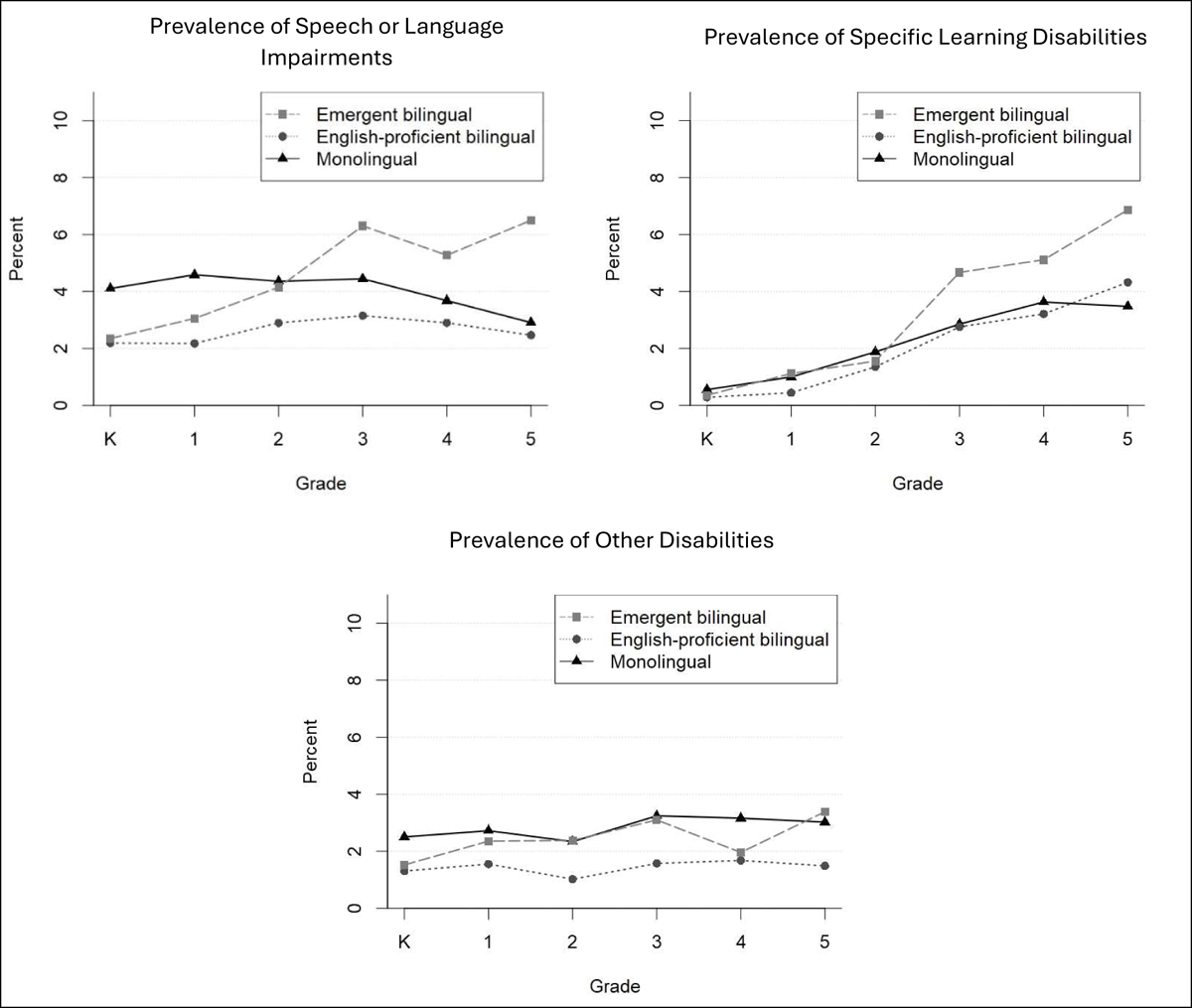 We identified several distinctions between emergent and English-proficient bilinguals with respect to the likelihood of being identified with a disability. One of the most salient differences between these two groups was the growth in SLI and SLD prevalence for emergent bilinguals, who experienced a sharp increase in incidence in third grade, leading to overrepresentation in subsequent grades, compared to monolinguals. The prevalence of SLI and SLD for English-proficient bilinguals, on the other hand, was generally lower than for monolinguals in early elementary school grades, but similar in later grades. This same growth in prevalence was absent in other disabilities, highlighting a similarity between SLI and SLD not shared with other disability categories.
