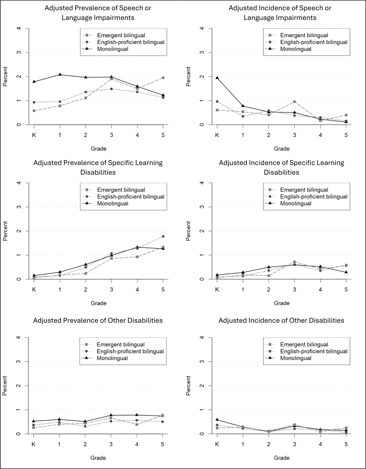 We examined the role of language background in predicting disability identification by comparing outcomes from reduced and full models. The outcomes from the full models, which included health, developmental, sociodemographic, and academic variables, diverged from those of the reduced models. When controlling for these variables, rates of service receipt for both emergent and English-proficient bilinguals were lower than for monolinguals from kindergarten through second grade. There were no grades in which either bilingual group exhibited a significantly higher adjusted prevalence of SLI than monolinguals. The adjusted prevalence of SLD for both bilingual groups was not significantly different than for monolinguals in all but second grade, in which emergent bilinguals had lower odds of receiving services. Like with SLI, from kindergarten to fifth grade, there were no grades in which the adjusted prevalence of SLD for either bilingual group was greater than for monolinguals. A significantly higher adjusted incidence was present in fifth grade only, for both emergent bilinguals in the SLI category and for English-proficient bilinguals in SLD category, but neither resulted in a significantly higher adjusted prevalence. Given the focus on kindergarten to fifth grade in the present study, further investigation into prevalence and incidence in later grades is warranted.