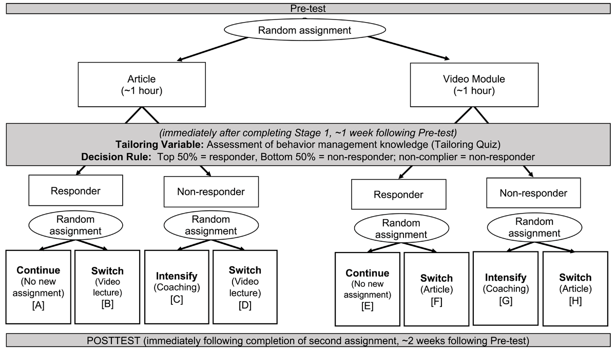 Power. Using a SMART power calculator (Kim et al., 2016) and assuming approximately 50% participants will be responders at the decision point, we estimated 68 participants were necessary to evaluate the initial effects and to ensure at least six participants fall in each final cell. We used effect size estimates from previous studies that tested the efficacy of our initial treatment stage (article vs. video module; see Kennedy & Thomas, 2012; d = .86 to 1.62). We did not compare individual cells; all analyses considered the primary or secondary randomization subgroups. Assuming power of 85% and a pretest covariate, and assuming .05 attrition during stage 1, an effect of .86 or greater (i.e., a minimal detectable effect or MDE) is detectable for p < .05 for the effect of the initial assignment to first-stage treatment, which is our main effect. The MDE for the best tactical decision for responders, is 1.72 assuming approximately 50% are responders following Stage 1 and assuming another .05 attrition. Though the MDE for the primary randomization is .86, previous studies that have compared effects of a reading/notetaking condition to a video module condition report an overall ES of d = .98 (see Kennendy & Thomas, 2012).