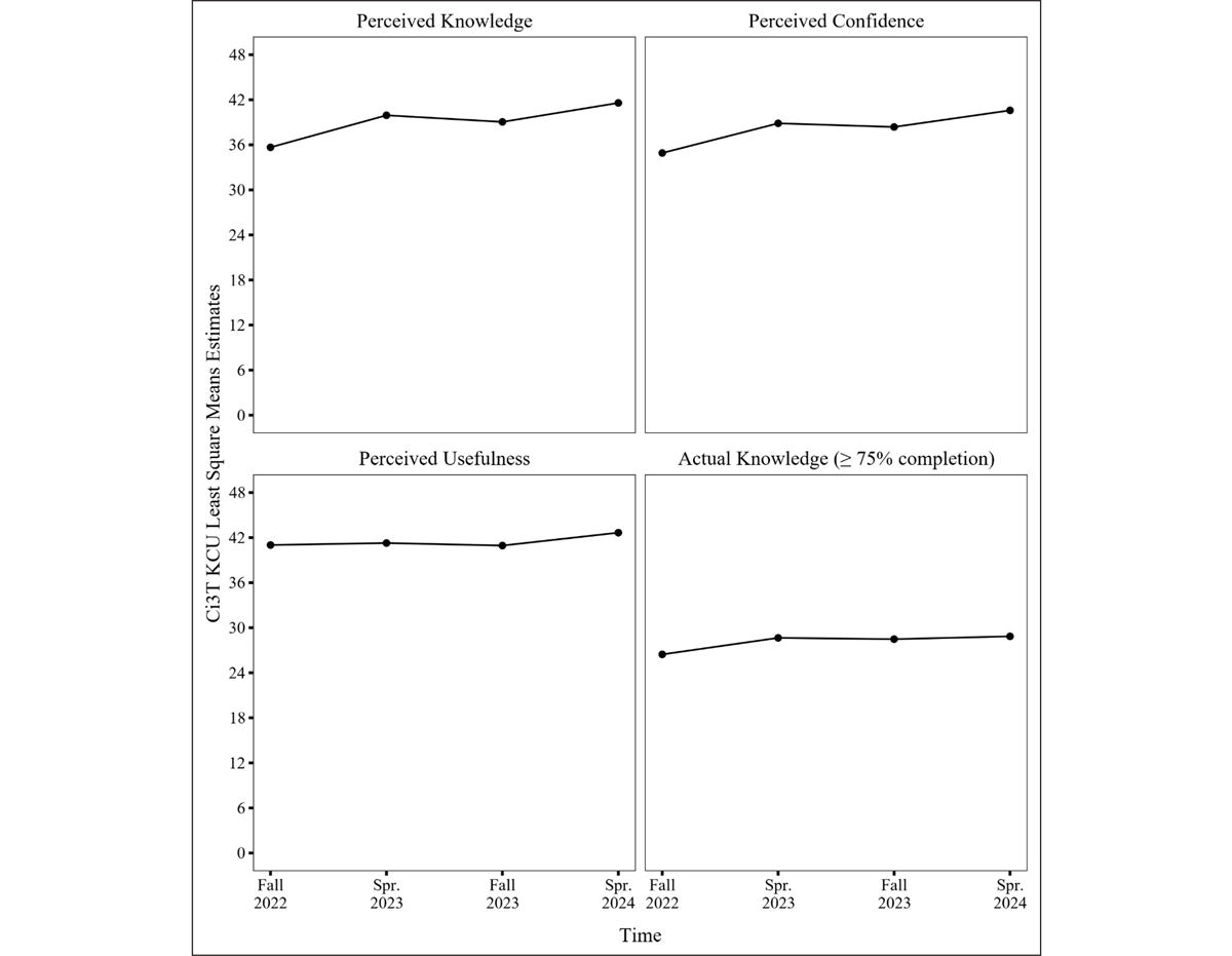 Findings in this study related to actual knowledge reflect challenges, perhaps related to adding the length of the original tool. First, participant response patterns on the updated Ci3T KCU measure yielded an important preliminary finding: it appeared the response effort required to complete the constructed response items constituting the actual knowledge component of the Ci3T KCU may have dissuaded participants from completing this portion of the measure. Namely, attempts to replicate previously used scoring procedures resulted in artificially low actual knowledge scores (see Table S2). Many participants completed the rating scale portion of the Ci3T KCU (i.e., perceived knowledge, confidence, usefulness) but answered fewer actual knowledge constructed response items (which followed the discrete responses for perceptions), resulting in low scores (and in many cases 0) for those participants and producing a commensurately low overall mean scores for this sample. We hypothesize this result could be a product of multiple factors, including administering the KCU via online survey (rather than paper-pencil form, as was done in Lane, Oakes et al., 2020) making it easier to skip items, or perhaps participants were more likely to skip items if they had completed the measure multiple times previously. Or, perhaps increasing from 8 to 16 open-ended items was simply an unreasonable increase in response effort for participants, resulting in them being less willing to complete the open-ended items relative to earlier studies.